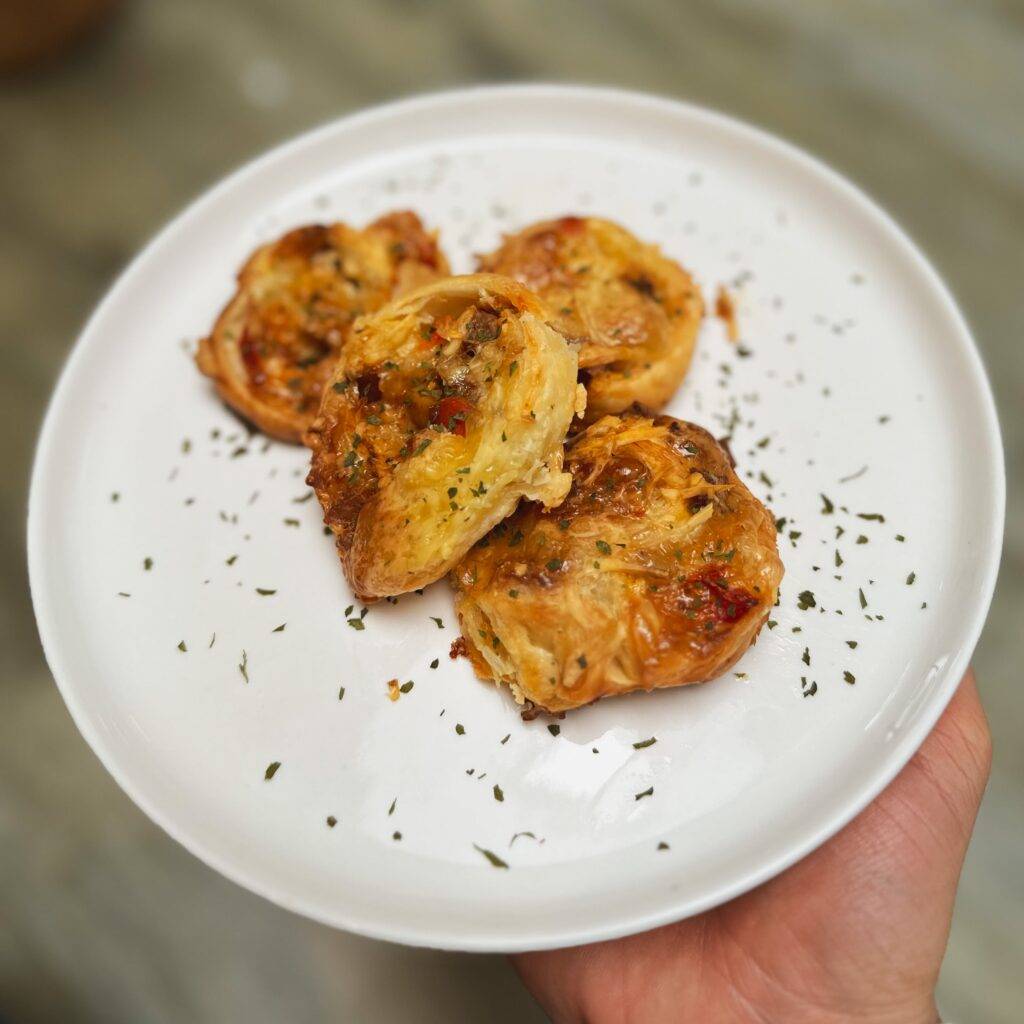 Anschließend wird der Blätterteig mit veganem Schmand bestrichen und mit dem krydda-Tofu, Zucchiniwürfeln und veganem Streukäse belegt. Nach dem Rollen und Schneiden werden die Pizzaschnecken im Ofen goldbraun gebacken.